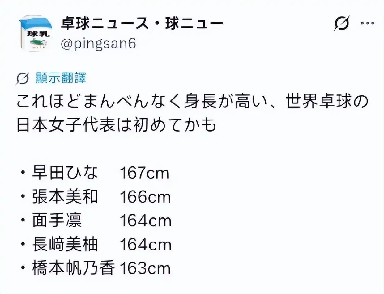 日本女队参加2024釜山世乒赛团体赛5名队员和教练从日本女队2024釜山世乒赛团体赛参赛5名队员的身高情况来看,伊藤美诚和平野美宇的打法特点偏重近台快攻,弹击技术的使用比例也较高。而早田希娜、张本美和的弧圈和快攻结合更为突出,在中台也具备较强的周旋能力。在以上身高特点与技术的关联之外,还有一个与战术运用的密切点值得关注。2028年洛杉矶奥运会首次增加乒乓球混合团体比赛(第五场为女双),女双重回奥运会乒乓球参赛项目当中,日本女队5名选手的平均身高的提高,一定程度上减少了双打比赛中被左右调动而出现空当的短板,同时,5名队员身高几乎接近,也为不同组合的搭配提供了选择空间。